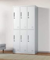Design: Rectangular cabinet structure with six individual compartments, each with its own lockable door.