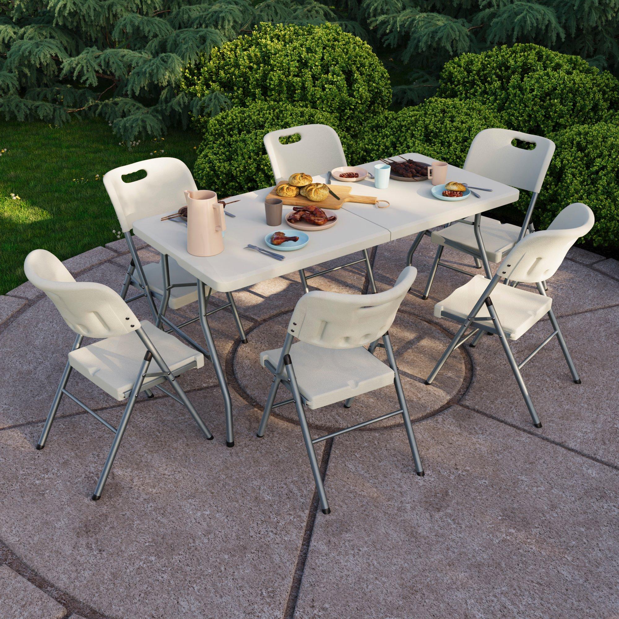 This table is great for entertaining. It can be used as a serving table, game table or outdoor dinning table. It features a polyethylene top with a sturdy tubular steel coated legs and frame. It sets up quickly and provides ample space for guests to sit and eat. It folds easily, it’s light-weight and compact to fit under a bed or in a large closet. Legs come with rubber footing to protect floor surfaces from damage. FEATURES: Granite off-white color; Durable, green environmental and recycled material HDPE; Construction Quality, High-density polyethylene (HDPE) lightweight blow-molded plastic; Light-weight, easy to move and store; Gray Powder Coated Wishbone legs; Heavy duty 25-gauge steel legs; Table surface is slightly textured to avoid scratching, but smooth enough to write on; Easy to clean – just use a mild soap and a soft-bristled brush; for tough stains, use a mild abrasive such as Soft Scrub; Water proof, resist acid, alkali and high temperature. Very long service life for several years; Gravity slide lock for extra stability; Can apply to many field for indoor, outdoor, commercial and entertainment use, such as home, office, restaurant, hotel, church, party, weddings and so on