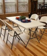 This table is great for entertaining. It can be used as a serving table, game table or outdoor dinning table. It features a polyethylene top with a sturdy tubular steel coated legs and frame. It sets up quickly and provides ample space for guests to sit and eat. It folds easily, it’s light-weight and compact to fit under a bed or in a large closet. Legs come with rubber footing to protect floor surfaces from damage. FEATURES: Granite off-white color; Durable, green environmental and recycled material HDPE; Construction Quality, High-density polyethylene (HDPE) lightweight blow-molded plastic; Light-weight, easy to move and store; Gray Powder Coated Wishbone legs; Heavy duty 25-gauge steel legs; Table surface is slightly textured to avoid scratching, but smooth enough to write on; Easy to clean – just use a mild soap and a soft-bristled brush; for tough stains, use a mild abrasive such as Soft Scrub; Water proof, resist acid, alkali and high temperature. Very long service life for several years; Gravity slide lock for extra stability; Can apply to many field for indoor, outdoor, commercial and entertainment use, such as home, office, restaurant, hotel, church, party, weddings and so on